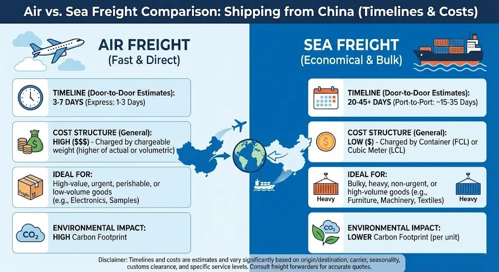 (Mai sus: infografic comparativ cu transportul aerian și maritim pentru transportul din China, evidențiind termenele și costurile)